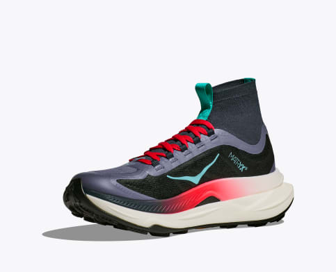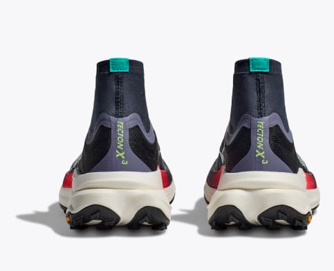Ready to propel you through gnarly terrain. the Tecton X 3 adds winglets to its carbon fiber plates for extra stability in just the right spots. and two layers of PEBA in the midsole¡ªour lightest. most resilient compound. Redesigned lug shape and positioning on a Vibram Megagrip with Litebase outsole provide better traction. while a dynamic vamp allows feet to splay as the miles fly by. Topping it off. a knit collar extends up from the tongue like a gaiter to mitigate trail debris. and a lightweight Matryx textile upper makes this version more durable and trail-worthy than ever.