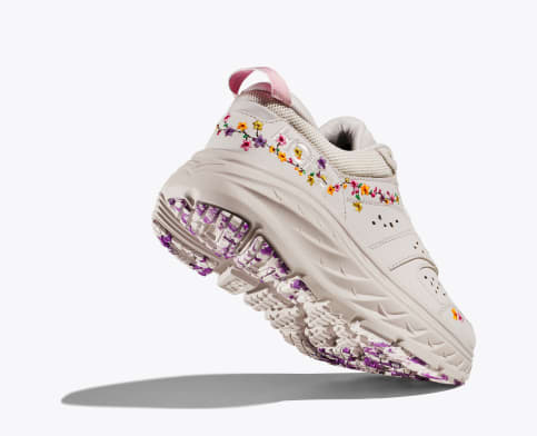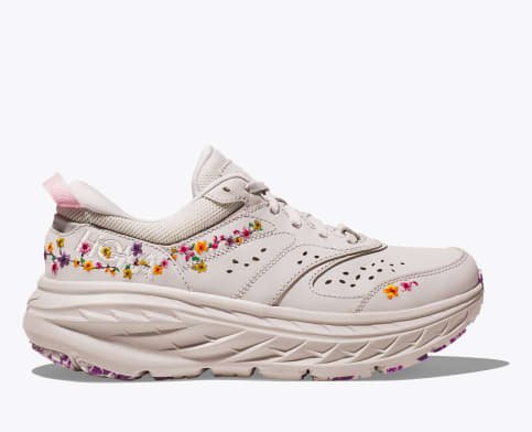 A new riff on our maximally cushioned road shoe. the Vibrant Bloom Bondi L is adapted for spring adventures with fresh pops of floral embroidery. Engineered with an early stage MetaRocker for a smooth transition through the gait cycle. this street staple features a premium nubuck upper. perforated panels. ultralight EVA midsole and marbled outsole.